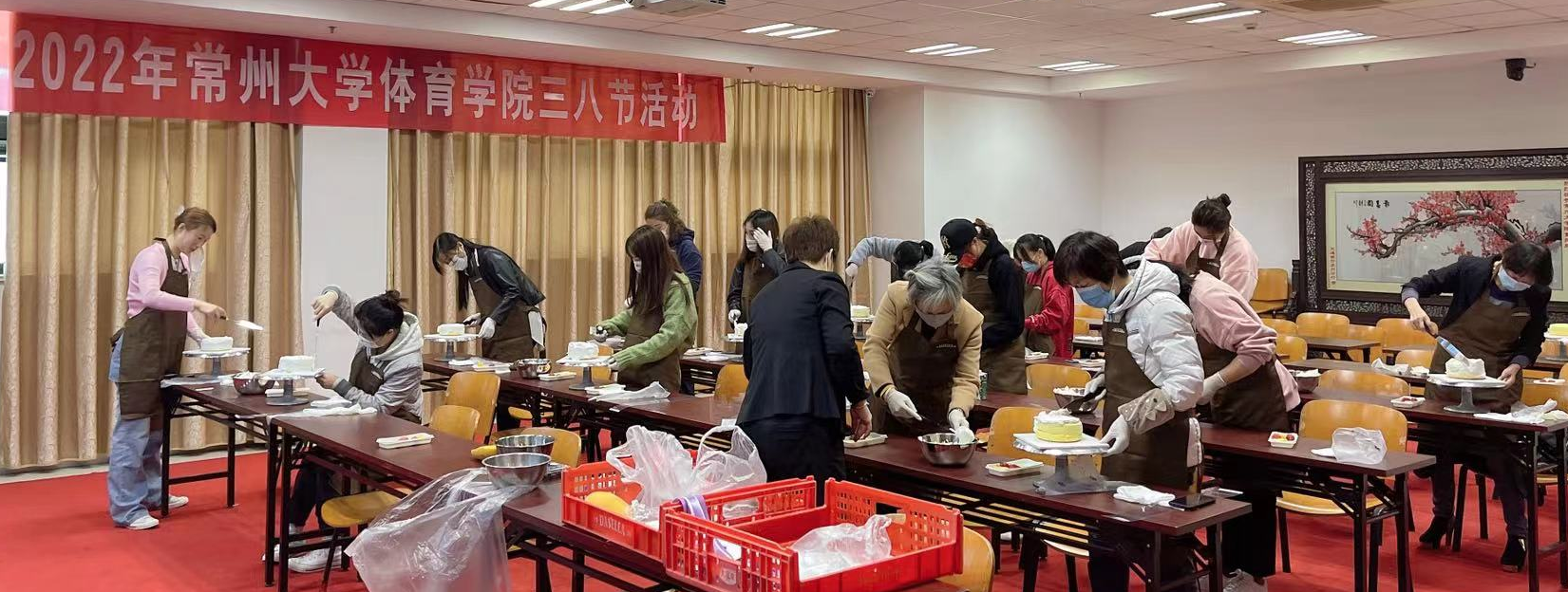 陽(yáng)春三月,桃花盛開(kāi),在這陽(yáng)光明媚的日子里,為慶祝第112個(gè)“三八”國(guó)際勞動(dòng)?jì)D女節(jié),豐富我院女教工的業(yè)余生活,緩解緊張的工作壓力,增強(qiáng)她們對(duì)生活的熱情,過(guò)一個(gè)快樂(lè)和充實(shí)的節(jié)日,體育學(xué)院分工會(huì)組織了“熱愛(ài)工作、更好生活”的DIY蛋糕活動(dòng)。 3月10日在體育館新聞中心,全體女教工圍上圍裙,拿好蛋糕制作工具,躍躍欲試,在蛋糕大師傅的培訓(xùn)和教學(xué)下,認(rèn)真與蛋糕和奶油做斗爭(zhēng),雖然動(dòng)作生疏,奶油涂抹也是不盡人意,但絲毫不影響老師們的學(xué)習(xí)熱情,她們發(fā)揮各自創(chuàng)意,利用裱花和水果,創(chuàng)造不同風(fēng)格的造型,創(chuàng)意十足。 通過(guò)這次活動(dòng),大家不僅親自感受到了DIY的樂(lè)趣,更加熱愛(ài)工作和生活,還增進(jìn)了彼此之間的友誼,大家紛紛表示,要以這種團(tuán)結(jié)友愛(ài)、積極向上的精神迎接新的學(xué)期和新的一年的工作。