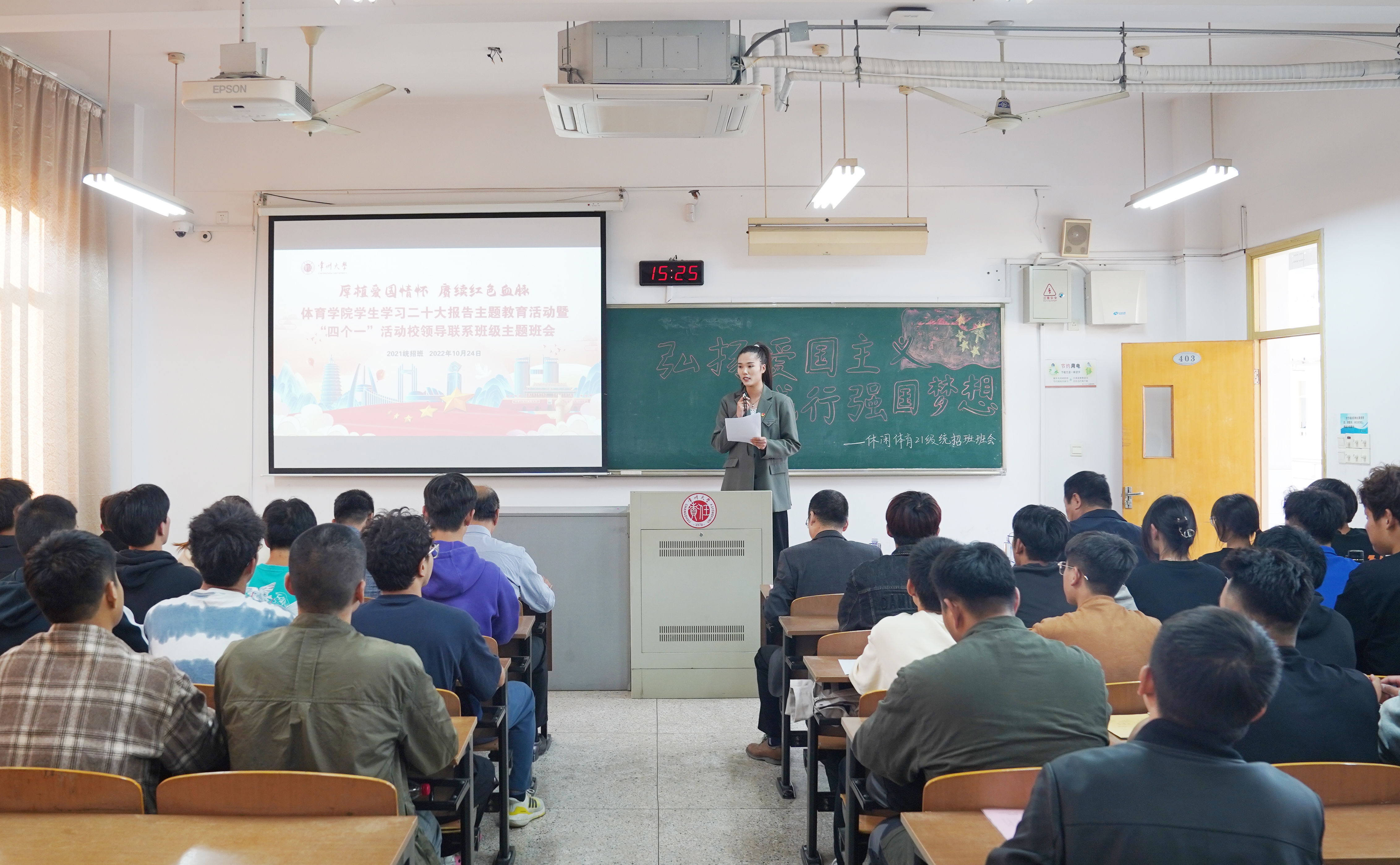 10月24日下午,體育21級(jí)統(tǒng)招班在教學(xué)輔樓401教室開展“弘揚(yáng)愛(ài)國(guó)主義 踐行強(qiáng)國(guó)夢(mèng)想”主題班會(huì)。本次主題班會(huì)是根據(jù)學(xué)院黨總支組織的“厚植愛(ài)國(guó)情懷 賡續(xù)紅色血脈”體育學(xué)院學(xué)生學(xué)習(xí)黨的二十大報(bào)告主題教育活動(dòng)要求開展,黨委常委、副校長(zhǎng)陸錦沖作為“四個(gè)一”活動(dòng)聯(lián)系學(xué)生班級(jí)的校領(lǐng)導(dǎo)出席班會(huì),體育學(xué)院相關(guān)負(fù)責(zé)人、輔導(dǎo)員、體育21級(jí)統(tǒng)招班全體同學(xué)參加班會(huì)。班會(huì)由班主任毛雯主持。 會(huì)上,團(tuán)支書王楚運(yùn)帶領(lǐng)同學(xué)們觀看愛(ài)國(guó)主義的相關(guān)視頻。班長(zhǎng)張思佳帶領(lǐng)同學(xué)們學(xué)習(xí)黨的二十大報(bào)告及習(xí)近平總書記關(guān)于愛(ài)國(guó)主義教育的相關(guān)論述。4名學(xué)生代表結(jié)合《長(zhǎng)津湖之水門橋》觀影感受分享對(duì)愛(ài)國(guó)主義的理解。 陸錦沖對(duì)本次班會(huì)的主題、內(nèi)容和組織表示肯定,對(duì)同學(xué)們的思想認(rèn)識(shí)和青春熱情表示贊揚(yáng)。陸錦沖從愛(ài)國(guó)主義的內(nèi)涵及新時(shí)代愛(ài)國(guó)主義的表現(xiàn)談起,分析了愛(ài)國(guó)主義和青年大學(xué)生發(fā)展的內(nèi)在聯(lián)系。他勉勵(lì)同學(xué)們要聽黨話、跟黨走,既要樹立遠(yuǎn)大理想,也要做到腳踏實(shí)地,積極融入到中國(guó)特色社會(huì)主義偉大事業(yè)中,在民族復(fù)興的時(shí)代浪潮中貢獻(xiàn)自己的力量。 班會(huì)最后,同學(xué)們邀請(qǐng)現(xiàn)場(chǎng)老師一起朗誦毛澤東詩(shī)詞《沁園春·長(zhǎng)沙》,表達(dá)青春斗志和報(bào)國(guó)熱情。