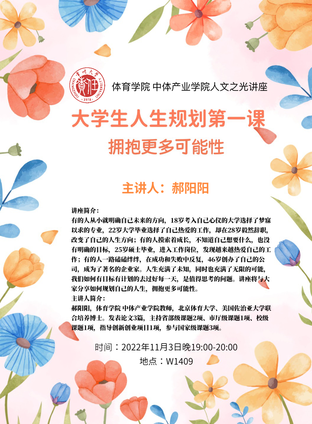 主講人:郝陽(yáng)陽(yáng) 講座時(shí)間:2022年11月3日 19:00-20:00 講座地點(diǎn):W1409 講座簡(jiǎn)介: 有的人從小就明確自己未來的方向,18歲考入自己心儀的大學(xué)選擇了夢(mèng)寐以求的專業(yè),22歲大學(xué)畢業(yè)選擇了自己熱愛的工作,卻在28歲毅然辭職,改變了自己的人生方向;有的人摸索著成長(zhǎng),不知道自己想要什么,也沒有明確的目標(biāo),25歲碩士畢業(yè),進(jìn)入工作崗位,發(fā)現(xiàn)越來越熱愛自己的工作;有的人一路磕磕絆絆,在成功和失敗中反復(fù),46歲創(chuàng)辦了自己的公司,成為了著名的企業(yè)家。人生充滿了未知,同時(shí)也充滿了無限的可能,我們?nèi)绾斡心繕?biāo)有計(jì)劃的去過好每一天,是值得思考的問題。講座將與大家分享如何規(guī)劃自己的人生,擁抱更多可能性。 主講人簡(jiǎn)介: 郝陽(yáng)陽(yáng),體育學(xué)院 中體產(chǎn)業(yè)學(xué)院教師,北京體育大學(xué)、美國(guó)佐治亞大學(xué)聯(lián)合培養(yǎng)博士。發(fā)表論文3篇,主持省部級(jí)課題2項(xiàng)、市廳級(jí)課題1項(xiàng)、校級(jí)課題1項(xiàng),指導(dǎo)創(chuàng)新創(chuàng)業(yè)項(xiàng)目1項(xiàng),參與國(guó)家級(jí)課題3項(xiàng)。