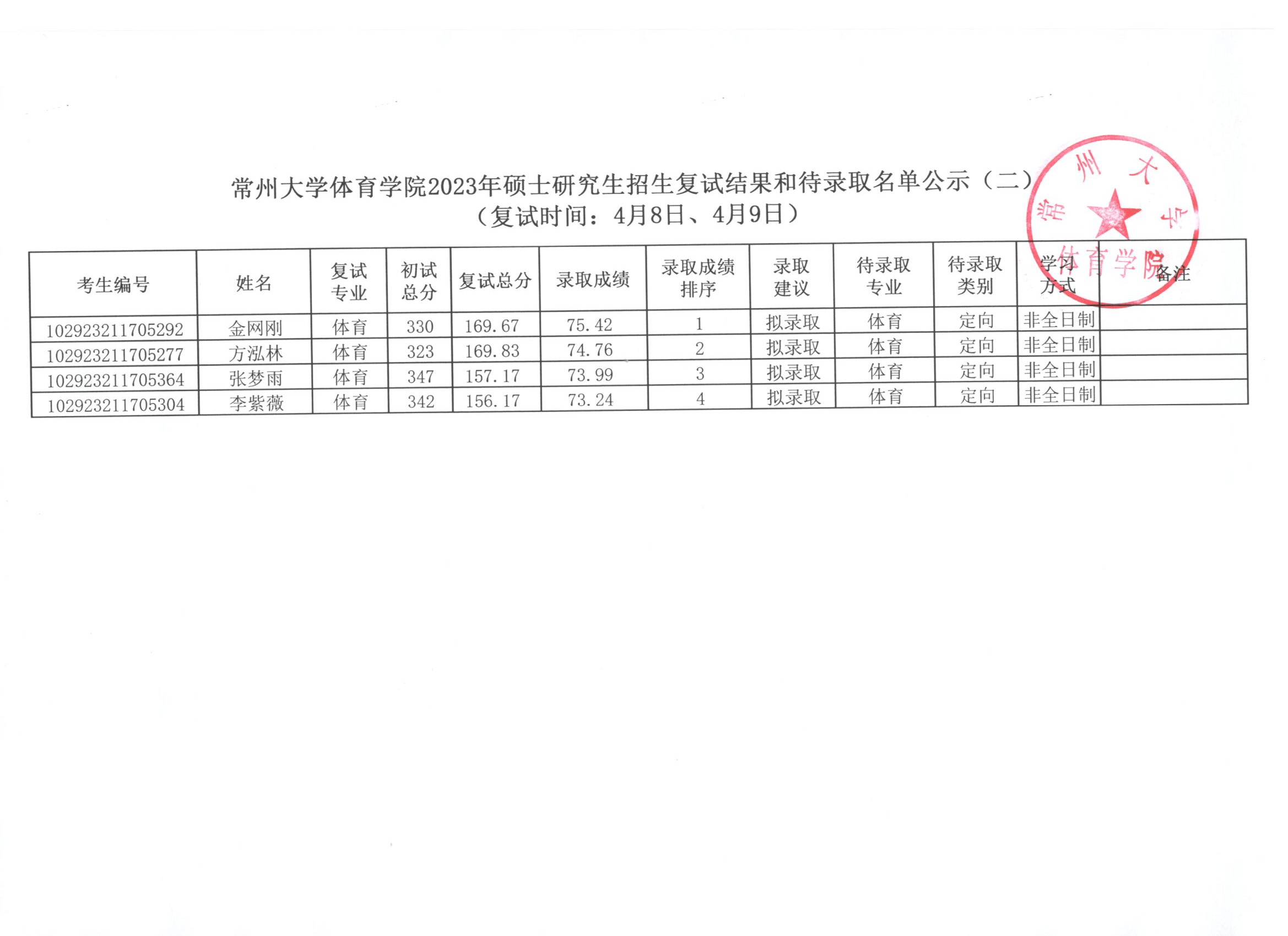 | 常州大學(xué)體育學(xué)院2023年碩士研究生復(fù)試結(jié)果和待錄取名單公示(二) |