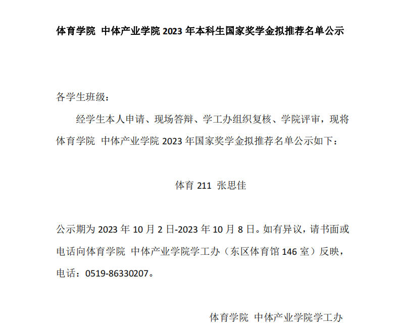 | 體育學(xué)院 中體產(chǎn)業(yè)學(xué)院2023年本科生國家獎學(xué)金擬推薦名單公示 |