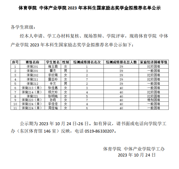 | 體育學(xué)院 中體產(chǎn)業(yè)學(xué)院2023年本科生國(guó)家勵(lì)志獎(jiǎng)學(xué)金擬推薦名單公示 |