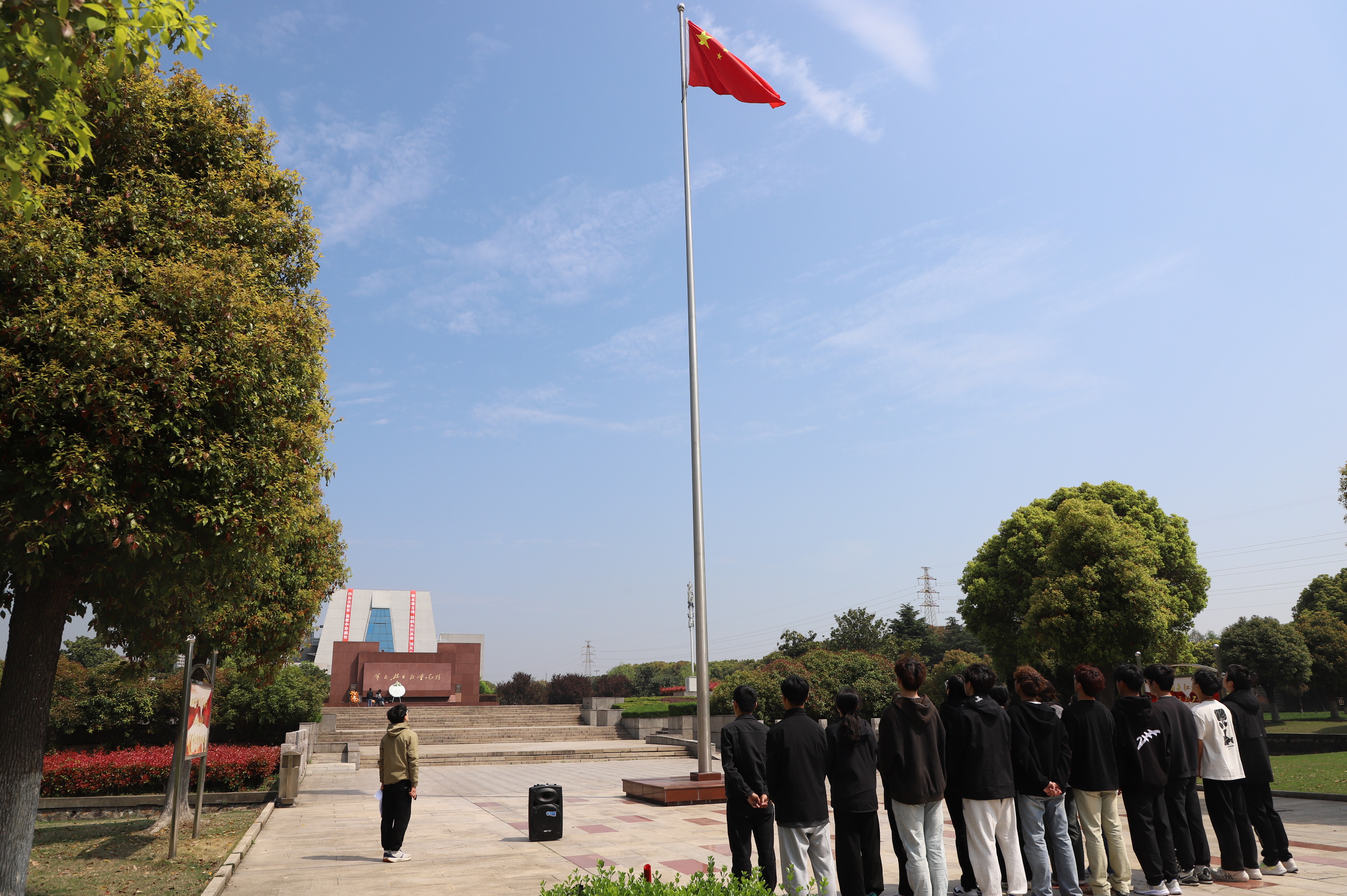 活動現(xiàn)場,全體師生奏唱《中華人民共和國國歌》,駐足脫帽,肅穆而立,默哀致敬。