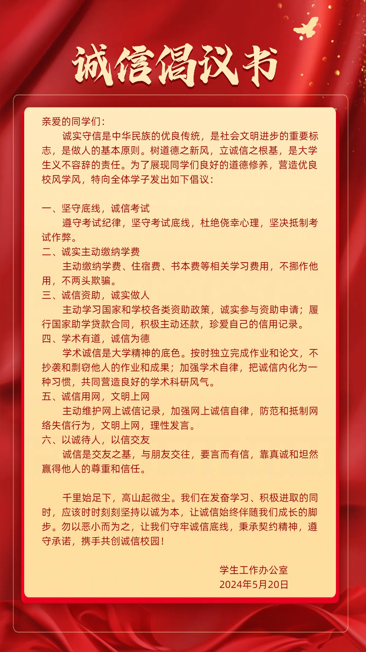 誠實守信,從我做起——誠信倡議書