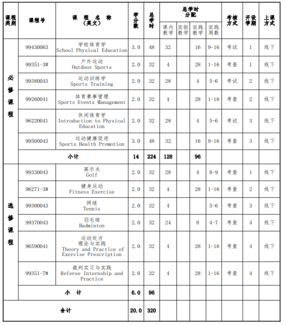 一、專業(yè)簡介 本專業(yè)依托的休閑體育專業(yè)是全國首批、江蘇首家休閑體育本科專業(yè),2021年獲批國家級(jí)一流本科專業(yè)建設(shè)點(diǎn)和體育碩士專業(yè)學(xué)位授權(quán)點(diǎn)。2018-2022年在武書連專業(yè)綜合評(píng)價(jià)中連續(xù)五年評(píng)為A等級(jí);其中2022年被評(píng)為A++等次,全國排名第一等學(xué)科行業(yè)優(yōu)勢(shì)。 結(jié)合體育碩士專業(yè)學(xué)位授權(quán)點(diǎn),堅(jiān)持學(xué)科引領(lǐng)專業(yè)發(fā)展,緊扣“四新”建設(shè)要求,以體育科學(xué)、教育學(xué)、管理學(xué)等傳統(tǒng)課程群為基礎(chǔ),推進(jìn)體育與醫(yī)學(xué)、信息技術(shù)等多學(xué)科跨界融合,通過設(shè)置“體育+””+體育”等新型交叉課程,培養(yǎng)適應(yīng)新時(shí)代社會(huì)發(fā)展需要的運(yùn)動(dòng)休閑與健康促進(jìn)領(lǐng)域的高素質(zhì)創(chuàng)新型專業(yè)人才。 二、主要課程 學(xué)校體育學(xué)、運(yùn)動(dòng)訓(xùn)練學(xué)、休閑體育學(xué)、戶外運(yùn)動(dòng)、體育賽事管理、運(yùn)動(dòng)健康促進(jìn)、運(yùn)動(dòng)處方理論與實(shí)踐、高爾夫、網(wǎng)球、羽毛球、裁判實(shí)習(xí)與實(shí)踐等課程。具體學(xué)分、學(xué)時(shí)數(shù)等詳見下表。 運(yùn)動(dòng)休閑與健康促進(jìn)微專業(yè)課程設(shè)置及學(xué)時(shí)分配表