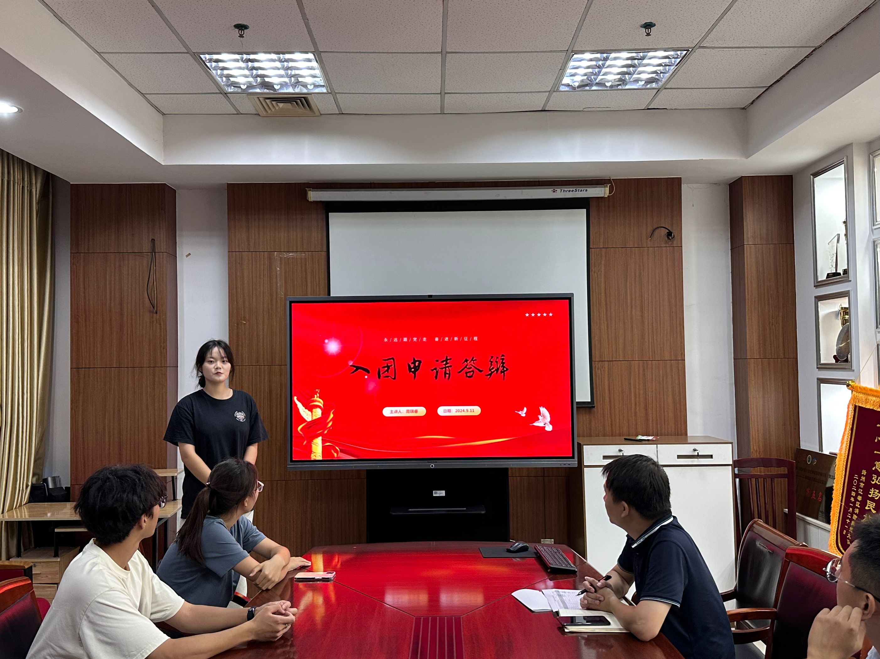 各位入團(tuán)積極分子以PPT的形式分別就個(gè)人對(duì)中國(guó)共青團(tuán)的認(rèn)知、政治理論素養(yǎng)、自身在校表現(xiàn)、未來(lái)發(fā)展方向四個(gè)方面進(jìn)行闡述,充分展示出青年大學(xué)生應(yīng)具備的帶頭示范作用、理論知識(shí)儲(chǔ)備、個(gè)人綜合素養(yǎng);評(píng)委根據(jù)答辯內(nèi)容和評(píng)審要求,進(jìn)行了針對(duì)性地提問(wèn),并給出意見(jiàn)和建議。