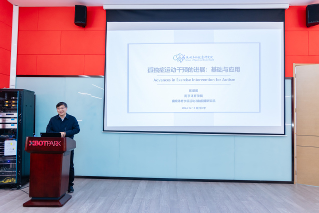 陳愛國教授作了題為《孤獨癥運動干預(yù)的研究進(jìn)展:基礎(chǔ)和應(yīng)用》的學(xué)術(shù)報告,報告從對孤獨癥認(rèn)識開始,介紹了該疾病當(dāng)前的最新研究動向,并介紹通過運動干預(yù)所起到的效果等最新研究成果。