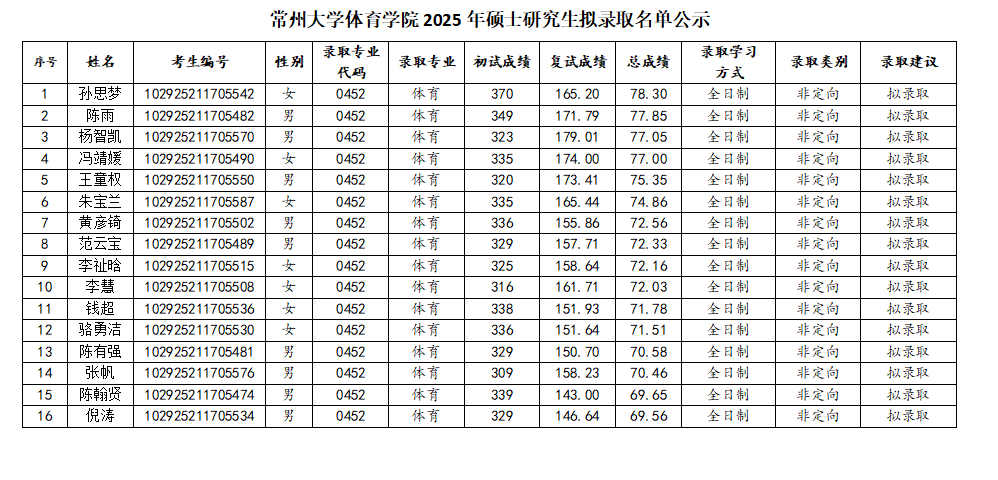 | 常州大學(xué)體育學(xué)院2025年碩士研究生擬錄取名單公示 |