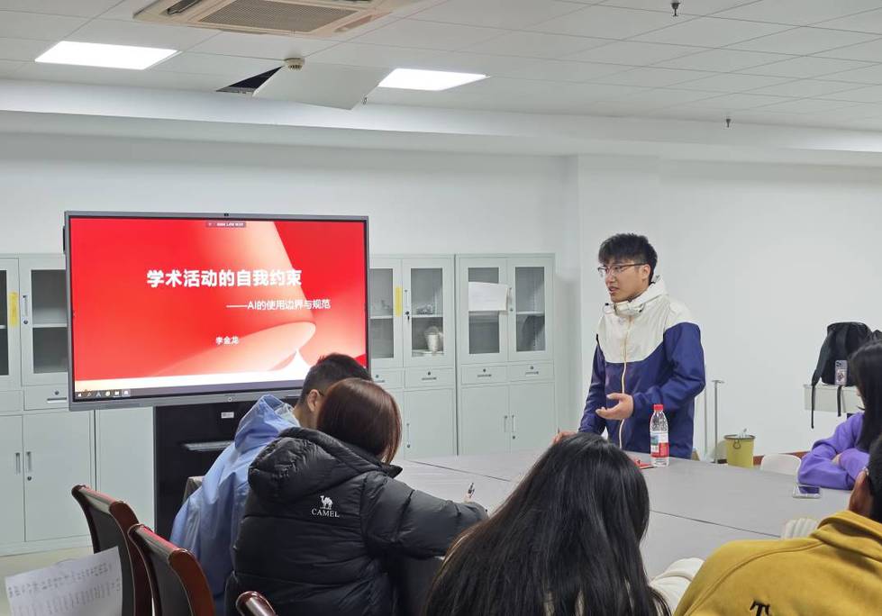 體育學(xué)院23級研究生李金龍以“學(xué)術(shù)活動的自我約束——AI使用邊界與規(guī)范”為題作了專題報告。其報告提出:隨著人工智能(AI)技術(shù)的快速發(fā)展,其在體育領(lǐng)域的應(yīng)用逐漸滲透到運動訓(xùn)練、運動醫(yī)學(xué)、體育數(shù)據(jù)分析、賽事管理等多個研究方向。然而,AI技術(shù)的引入既為學(xué)術(shù)研究帶來高效性與創(chuàng)新性,也伴隨著數(shù)據(jù)倫理、技術(shù)依賴性和應(yīng)用局限性等問題。