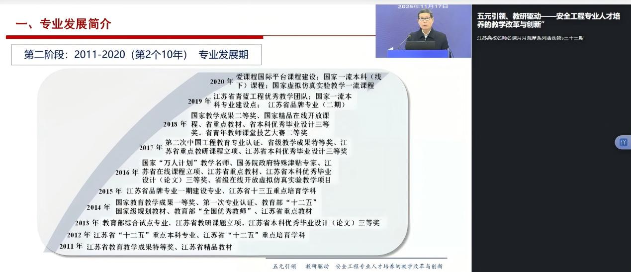為深化教學改革,創(chuàng)新人才培養(yǎng)模式,11月17日下午,體育學院、教務(wù)處、教師發(fā)展中心組織教師線上觀看“江蘇高校名師名課月月觀摩”第三十三期活動。本次活動由邵輝教授主持,圍繞“五元引領(lǐng),教研驅(qū)動——安全工程專業(yè)人才培養(yǎng)的教學改革與創(chuàng)新”主題展開深度分享。 活動中,邵教授結(jié)合多年教學實踐與教研經(jīng)驗,系統(tǒng)闡釋了“五元引領(lǐng)”的核心內(nèi)涵,即堅持立德樹人、學科前沿、行業(yè)需求、實踐能力、創(chuàng)新思維五大導(dǎo)向,構(gòu)建“教研融合、知行合一”的人才培養(yǎng)體系。他通過具體教學案例,詳細介紹了安全工程專業(yè)在課程體系優(yōu)化、教學方法創(chuàng)新、實踐平臺搭建等方面的改革舉措,強調(diào)以教研項目為紐帶,推動教學內(nèi)容更新與學生創(chuàng)新能力培養(yǎng)的協(xié)同發(fā)展。 此次觀摩活動為我院教師提供了學習交流的平臺,有效拓寬了教學改革思路。下一步,我院將持續(xù)聚焦人才培養(yǎng)核心,推動教研深度融合,不斷提升教育教學水平與人才培養(yǎng)質(zhì)量。