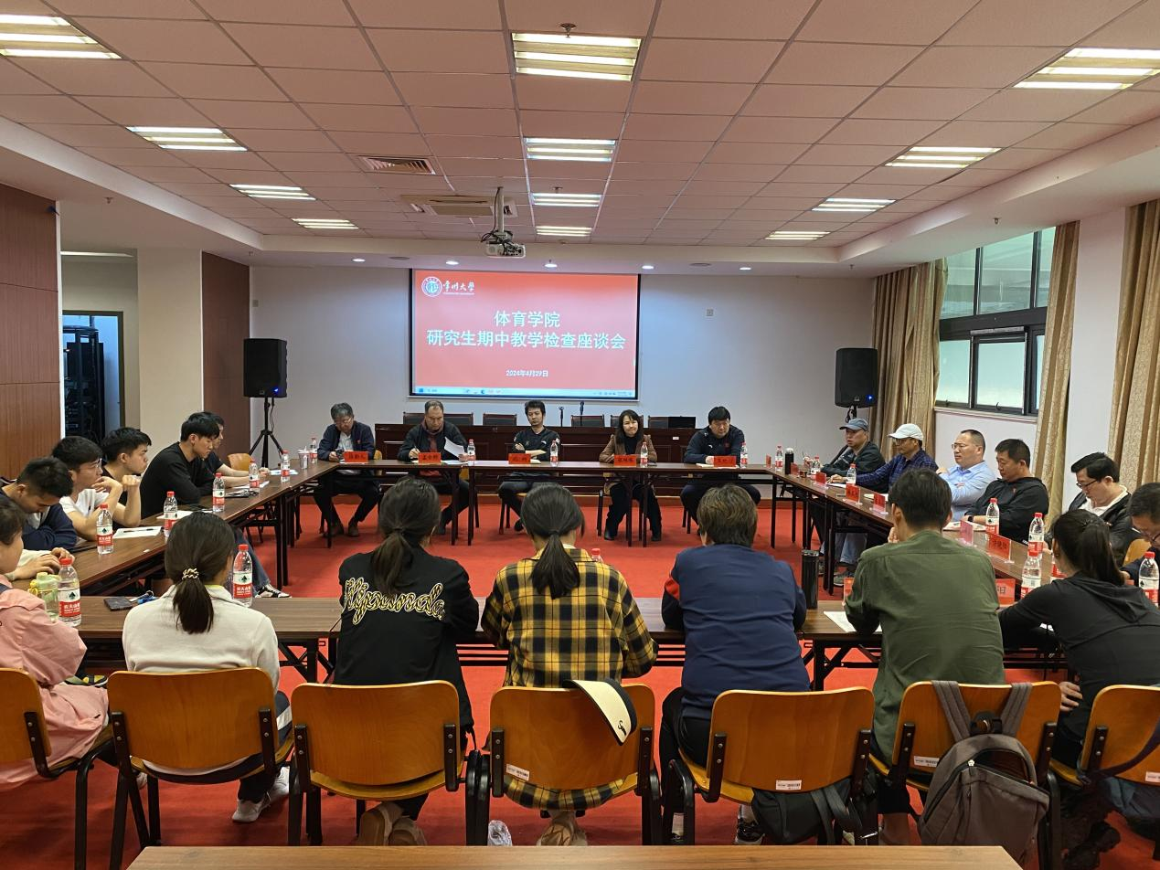 按照學(xué)校期中教學(xué)檢查工作部署安排,為進(jìn)一步嚴(yán)格規(guī)范教學(xué)管理,扎實(shí)推進(jìn)教風(fēng)、學(xué)風(fēng)建設(shè),不斷提升課堂教學(xué)水平,提高人才培養(yǎng)質(zhì)量,4月29日,我院召開了2023-24學(xué)年第二學(xué)期碩士研究生期中教學(xué)檢查座談會(huì)。校研究生教育督導(dǎo)員張琳琳教授、體育學(xué)院黨總支書記沈綱、院長(zhǎng)王紀(jì)信、副院長(zhǎng)孟令剛以及全體碩士研究生導(dǎo)師、任課老師、研究生秘書、學(xué)工辦主任和2023級(jí)全體研究生參加此次座談會(huì)。